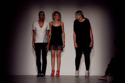 Jiska van Rossum showed a tough menswear collection. Van Rossum presented her interpretation of the 'New Man', a man who is seductive by showing his vulnerability. She translated this concept with covering and uncovering the naked body, with slits and openings in classic pieces of clothing. It is clear that her fashion puts men in a new spotlight of being looked at, to stand out. Van Rossum used hard and soft materials, knitting’s, curved as well as straight lines, big draping shapes versus rigid and classical elements of masculine silhouette. Very strong silhouettes and a promising new talent in the fashion field.
